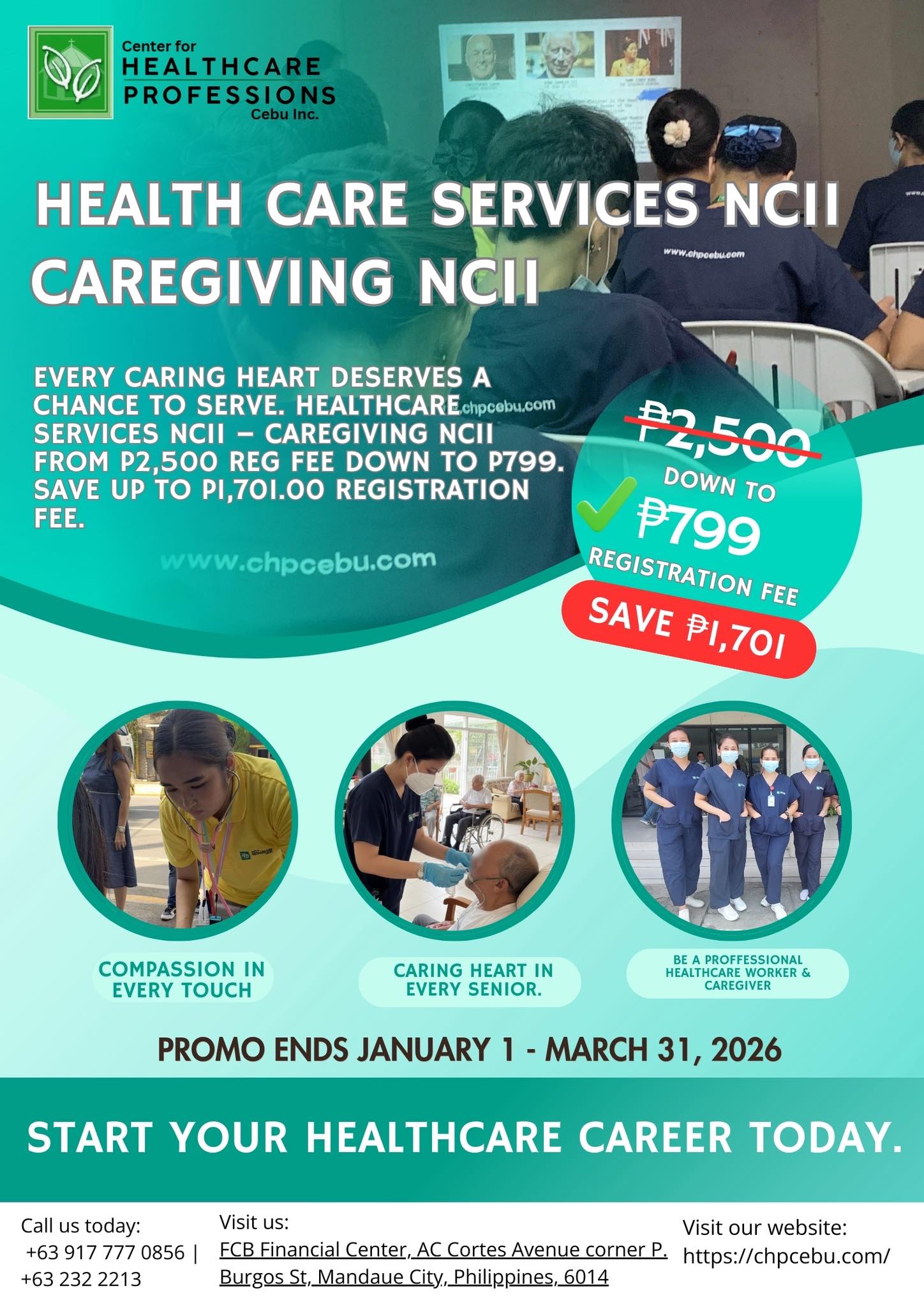 Every caring heart deserves a chance to serve. Enroll now in Health Care Services NCII & Caregiving NCII at Center for Healthcare Professions Cebu, Inc. and take your first step toward a meaningful and rewarding healthcare career.